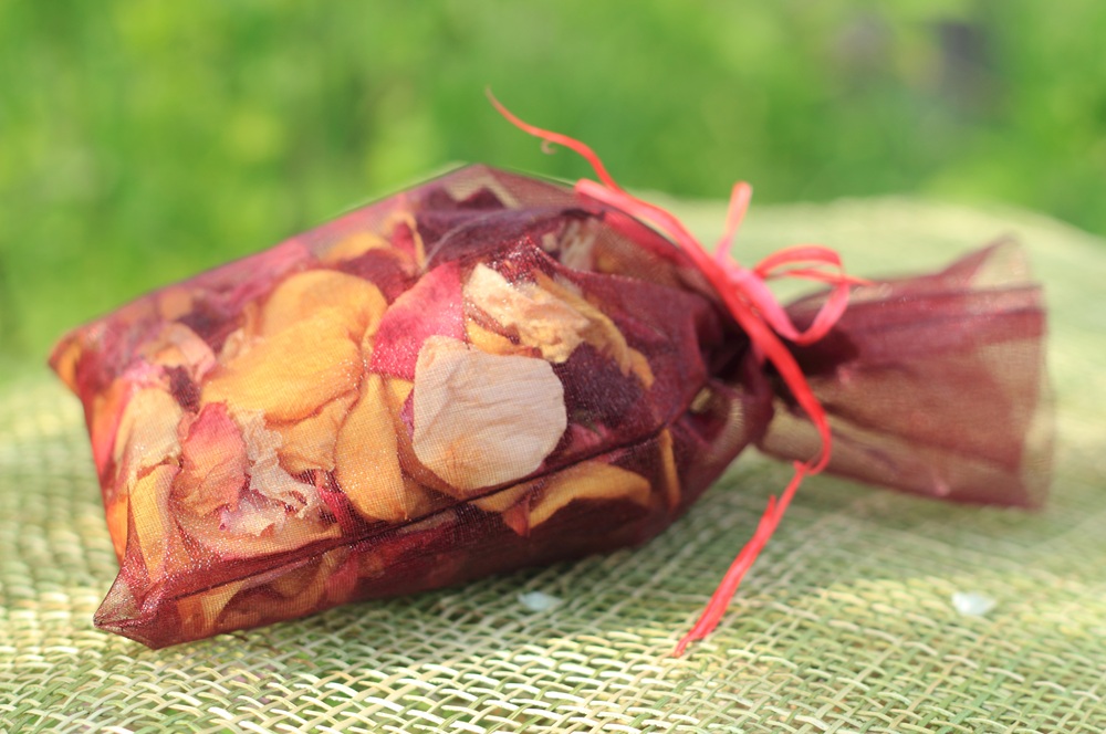 Comienza por secar los pétalos de rosa. Para ello colócalos sobre papel de periódico y déjalos en un lugar cálido y sin humedad durante unos días. Combina estos pétalos con otros elementos aromáticos y añade unas gotas de esencia de rosa. Coloca la mezcla dentro de la bolsita y átala con una cinta o cordón.