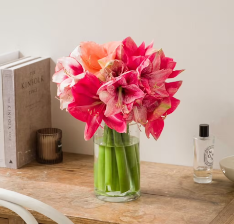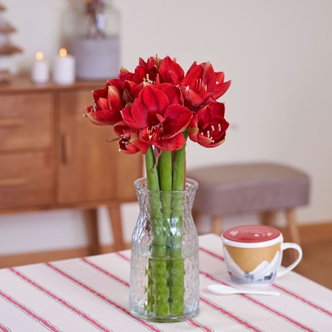 Las amarilis cortadas son espectaculares por su tallo carnoso desprovisto de hojas y sus elegantes flores en forma de campana. Las amarilis suelen elegirse para componer ramos de temporada porque duran frescas entre dos y tres semanas. Solo tendrás que cambiar el agua del jarrón cada dos días y cortar ligeramente los tallos, ya que esta flor de bulbo sigue creciendo una vez cortada.
